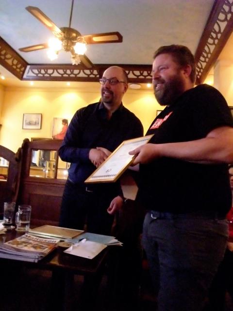 Som slutpunkt delades tre guldpinnar ut. Först kallades vår eminente redaktör Robert Lagerström fram för att erhålla nål och diplom. Motiveringen för hans fina insatser för vår medlemstidning var som följer: ”Robert har förvandlat Sveriges äldsta tidning om öl till Sveriges bästa tidning om öl. Med en spjutspetskänsla för att hålla innehållet balanserat mellan kritiska reportage, snyggt foto och djupgrävande teman har Maltesen gjort en fantastisk transformation under Roberts ledarskap.”